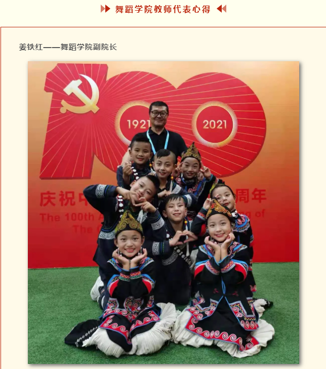 今年有幸受邀参与了庆祝中国共产党成立100周年文艺演出《伟大征程》的节目编创,能够有机会在这样重大的演出中贡献力量是我一生的荣光。通过亲历这样的高光时刻,我的精神受到了一次深刻的洗礼,我深刻了解了党这100年来艰苦卓绝的奋斗史,深刻体会到了党带领全国人民走进新时代,实现全面小康伟大征程的不易,更加强化了永远跟党走,永远感恩党,为国家的繁荣昌盛拼搏努力的坚定信念。
