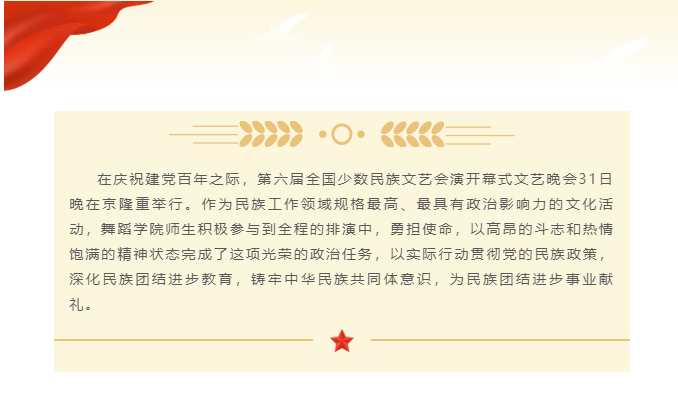 在克服种种困难后,威廉希尔williamhill官方网站师生圆满完成第六届全国少数民族文艺会演开幕式文艺晚会,党员师生们冲锋在前,用实际行动践行民族团结一家亲,同心共筑中国梦的家国理念,激励同学们坚定信仰信念,保持爱国初心,以永不懈怠的精神状态和一往无前的奋斗姿态,为新时代的繁荣继续奋斗。