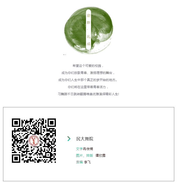2017 年的 9 月,我们从五湖四海汇集到祖国的心脏,踏进美美与共,知行合一的民大土地。伴随着初秋的阳光,稚嫩的脸庞上却是充满野心的眼神,同时还包含着对未来的期盼..... 时光荏苒,我们留不住时间,目之所及,四年过后的如今,2021年的9月,即将开始我的研究生生活。熟悉的校园,未知的三年,踏上了学术征途的我,脸庞不再稚嫩,眼神却依旧坚定。此征程万里风正劲,重任千钧再出发,改变的,是我更加成熟饱满的内心;不变的,是我对舞蹈始终如一的热爱。未来的三年我们又将踏入新的征程,前路迢迢,让我们奋斗的身影留在校园,留在青春里!