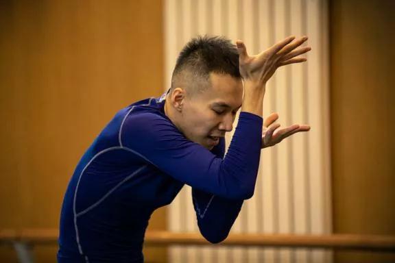 第二部分,2005级校友李德戈景讲授蒙古族舞蹈。他以风格教学为主,利用动感的音乐让学生们感受蒙古族人驰骋草原的豪迈自如。他的教学简而有序,以蒙古族硬腕为切入点,强调小关节的细节把控,根据学生的学习进度,逐渐加入舞蹈步伐。