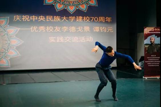 第一部分,2012级校友谭钧元现场展示了个人舞蹈作品《孔》的片段。一举一动无一不在诉说着舞者对作品的深度诠释。他精湛的舞蹈表演能力与忘我的状态渐渐把在场的师生们引入佳境。