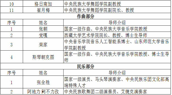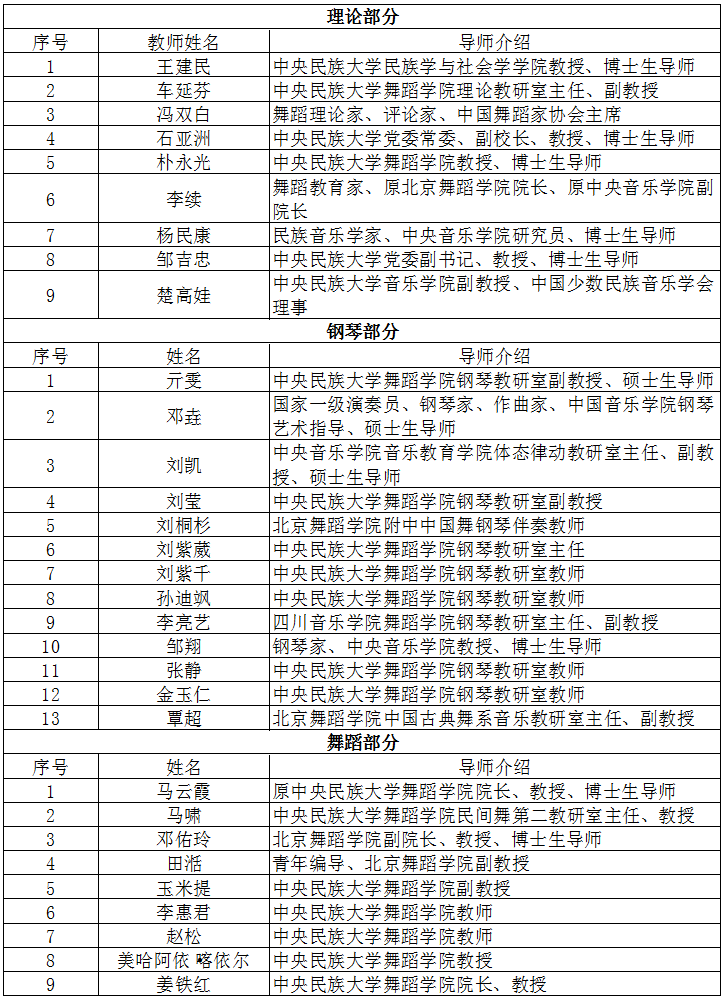 本项目拥有雄厚的师资力量,集聚了中央民族大学、中央音乐学院、中国音乐学院、北京威廉希尔williamhill官方网站、四川音乐学院、中央民族歌舞团、中央民族乐团、中国舞蹈家协会、中国音乐家协会等高校、团体、协会的专业师资,组建了由权威音乐理论家、钢琴演奏家、舞蹈教育家、舞蹈理论家、民族音乐作曲家联手打造的强大教学团队,致力于培养高质量的民族舞蹈钢琴艺术指导专业人才。