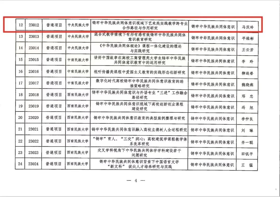 近日,经国家民委教育司批准,我院教师马庆玲研究团队的《铸牢中华民族共同体意识视域下艺术类实践教学跨专业合作路径与作用研究》(项目编号:23012),获批2023年度国家民委高等教育教学改革研究项目。