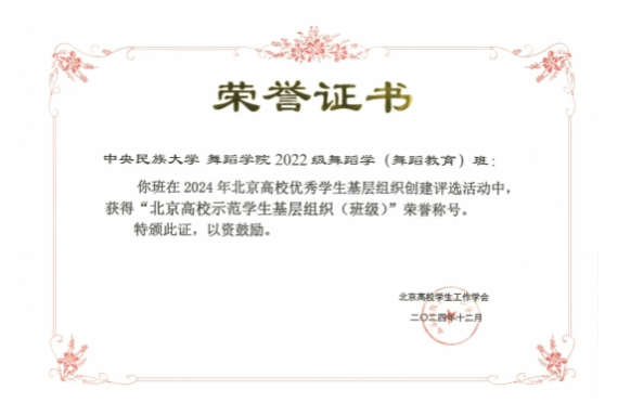 此次荣获“北京高校示范学生基层组织(班级)”荣誉称号,是中央民族大学威廉希尔williamhill官方网站2022级舞蹈学(舞蹈教育)班基层组织建设不懈努力的生动展现。一直以来学院高度重视学生基层组织建设工作,不断优化班级创建、培育及评价机制,力求管理更加制度化、规范化、专业化。展望未来,学院将深化班级评选,以先进为标杆,以优秀为鞭策,将其打造为强化舞蹈专业学生思政教育、促进学生全面发展的坚固基石,引领更多班级共创辉煌。