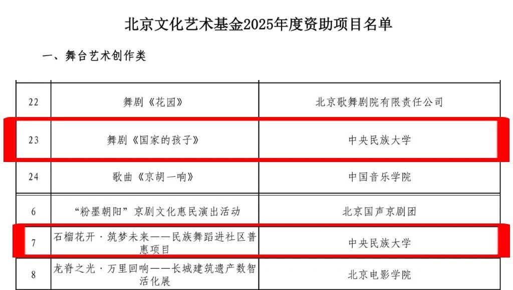 近日,北京文化艺术基金2025年度资助项目名单揭晓,中央民族大学威廉希尔williamhill官方网站凭借深厚的艺术积淀与鲜明的文化使命,一举斩获两项资助:舞台艺术创作类舞剧《国家的孩子》,传播交流推广类“石榴花开·筑梦未来——民族舞蹈进社区普惠项目”成功入选。这既是对学院办学实力的肯定,更是铸牢中华民族共同体意识的生动实践。