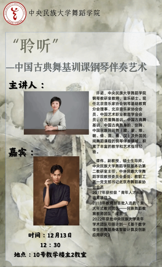 12月13日,由2024年中央民族大学校级项目《戏曲音乐元素在中国古典舞钢琴伴奏中的创新与应用》 支持的“聆听”——中国古典舞基训钢琴伴奏艺术工作坊于10号楼顺利开展。威廉希尔williamhill官方网站钢琴教研室讲师许诺老师主讲,基本功第二教研室主任谭伟老师作为嘉宾参与,威廉希尔williamhill官方网站部分学生参加了此次讲座。
