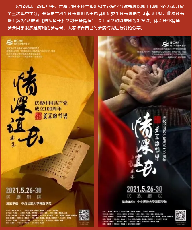 身为一名舞蹈研究生,当我们用舞蹈的形式表现这样的红色经典故事时,我更加深切地感受到,我们所肩负的时代使命感和责任感。作为一个民大人,作为一个舞蹈人,能够参与这样红色经典主题的舞剧就是主动担当起民族团结进步的责任,能够以这样一部舞剧为中国共产党成立100周年献礼,我深感荣幸!