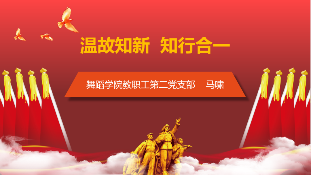 首先,马啸同志结合我院近期进行的“榜样启航新征程”的活动,在党课中,以“温故而知新”——重温我们的老前辈们是怎样在教学工作中为我们作出表率和榜样的。老一辈的教师给我们留下的不仅仅是他们倾其一生的教学实践所编创的教材,更宝贵的是教材背后他们的精神、理念、思想。我们不仅要将他们的精神传递下去,还要将他们所积累的经验提升至理论的高度,而非在教学环节中复制粘贴,只有这样才能够对我们的舞蹈学科作出一定的贡献。