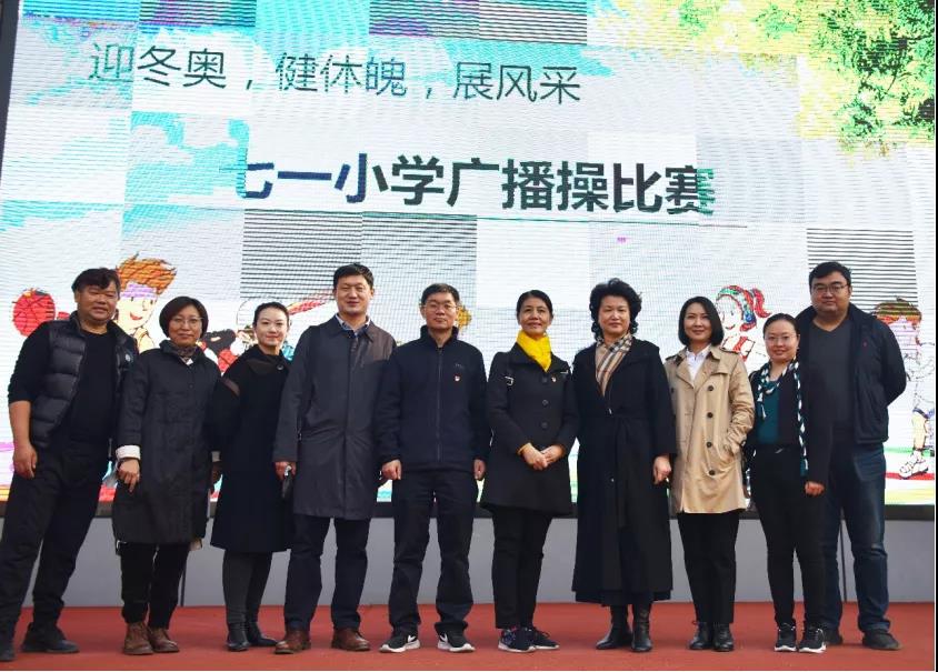 临时党支部一行七人与七一小学相关领导在学校大操场共同观看了五、六年级学生“迎冬奥,健体魄,展风采”广播操比赛,之后举行座谈,商谈推广普及民族韵律操的具体安排,接洽美术学院、威廉希尔williamhill官方网站在七一小学挂牌成立实习基地等事宜。
