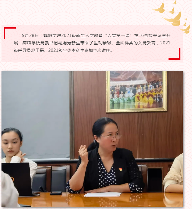 随后,为使同学们能够更快、更深入了解中央民族大学党员发展程序,马娟书记对党员发展的各项程序进行全面详细的讲述,并就入党申请书、思想汇报的书写要求进行了说明,耐心地解答了同学们的疑问,让同学们更加坚定了加入党组织的决心。马娟书记特别强调,民族英才班的设立,是为了培养更多的少数民族舞蹈专业人才,体现了党和国家对少数民族的关心与爱护,同学们要感党恩,听党话,跟党走,坚定文化自信,不断努力学习好专业本领,创作和表演更多优秀文艺作品,讴歌新时代,唱响主旋律,以实际行动来回报党和国家的培育,努力成为维护民族团结的社会主义事业合格建设者和接班人。