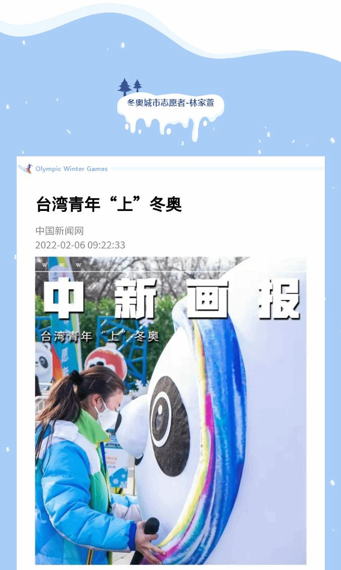 特别感谢央视、央广、新华社、新华港澳台、中新社、人民网、看台海、China Daily、凤凰卫视、新京报、TVBS、冬奥会刊、北京日报、中国日报、京彩台湾、中国新闻网、台盟中央、北京台盟、海淀青年、环球时报、AM585东南广播、I紫竹、ETtoday新闻云、台胞之家、海淀青年、北京海淀、东森新闻 CH51、北京青联、全国青联、今日台湾、湾湾family……等等各大媒体的采访及新闻,