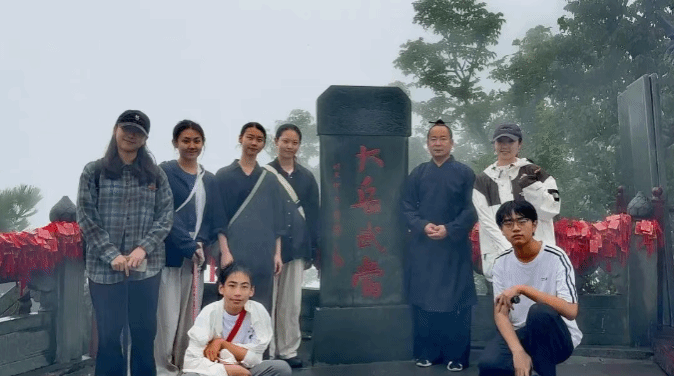 清晨,山间晨雾未散时,同学们便已在三清殿前开启晨练,伴随鸟鸣与簌簌山风调整呼吸,让身体的舒展与自然节律相融。白天跟随道长习练八卦掌、趟泥步,从“绕圆走转”开始练习重心沉实,到学习招式“叶底藏花”“鸿雁出群”,每一招一式看似徐缓,却蕴藏着内在的力量与节奏。夜爬金顶的经历,更是一次精神与意志的磨炼。陡峭石阶上相互扶持,途遇风雨,登顶时虽未遇日出,却在云雾翻涌间,以身体的坚韧跋涉,更深切理解武当文化中“守正持恒”的精神内核。