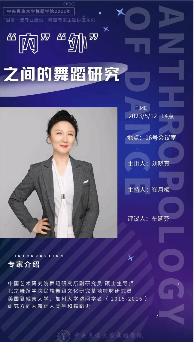 5月12日下午,中央民族大学威廉希尔williamhill官方网站组织开展的“国家一流专业建设”特邀专家主题讲座——《‘内’‘外’之间的舞蹈研究》在16号楼会议室顺利举行。本场讲座由中国艺术研究院舞蹈研究所刘晓真副研究员主讲,本院教师和研究生参加了此次讲座。此次讲座立足当今舞蹈学科的发展使命,以开放性、整体性和前沿性的知识结构,为大家带来更为多元的思考与新见。