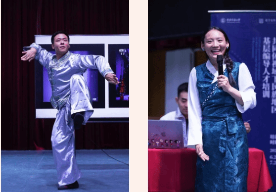 学员马晓燕(回族)讲解了回族舞蹈的基本动作,并与王文鑫一同演绎了独特的“牛骨响板舞”。学员王文鑫(回族)展示了男子群舞《匠心》。学员桑杰卓玛(藏族)分享了当地的非遗舞蹈,并为大家唱起了优美动听的“藏戏”。学员迪力拜尔·买买提明(维吾尔族)介绍了新疆各地的“赛乃姆”,并与米尔阿迪力江·音克拉甫共同表演了“哈密赛乃姆”、“喀什赛乃姆”等。学员永康(蒙古族)讲述了“萨乌尔登”舞蹈与“托布秀尔”的关系,并现场展示了一段经典的“萨乌尔登”。 学员王燕(汉族)形象地再现了“大唐乐舞”,并分享了当地的习俗文化。学员苏德一兰(达斡尔族)介绍了非遗舞蹈“毕力多尔”。学员叶斯波力(哈萨克族)分享了哈萨克族的民族文化,并形象地演绎了哈萨克族的“哈熊舞蹈”。学员付阳雪(汉族)详细地介绍了“龟兹乐舞”。学员米尔阿迪力江(维吾尔族)细致地讲解了“塔吉克族舞蹈”。