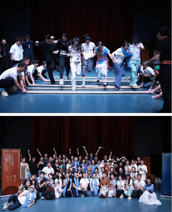 学员巴斯基(藏族)将自己在西藏、四川等地多年来的学习研究与所闻所感进行分享,向大家展现出独具特色的民族生活场景。学员何燕利(汉族)现场展示了羌族胯画圆动律与披毡舞蹈。学员龚卓(汉族)将自己对“四川白马藏族民俗舞蹈”的研究成果进行分享。学员范逸飞(汉族)将自身在四川民族地区学习和采风的经历进行分享,并和龚卓现场展示了羌族古老的羊皮鼓舞片段。学员杜泽辉分享重庆地区的民间传统艺术“秀山花灯”,并现场展示素材片段。学员邓芳分享了海南非遗艺术“打柴舞”。最后,在热烈的氛围下,吸引在场所有人上台一起进行跳竹竿活动,载歌载舞欢聚一堂。