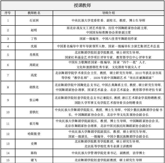 本项目拥有雄厚的师资力量,集聚了国际一级导演、国家一级编剧、业内知名编导、中央民族大学、北京威廉希尔williamhill官方网站 、中央民族歌舞团 、团体协会的专业师资 ,组建了由权威舞蹈理论家 、舞台导演 、舞蹈教育家 、民族舞蹈编导联手打造的强大教学团队,致力于培养高质量的民族舞蹈创意开发编导专业人才。