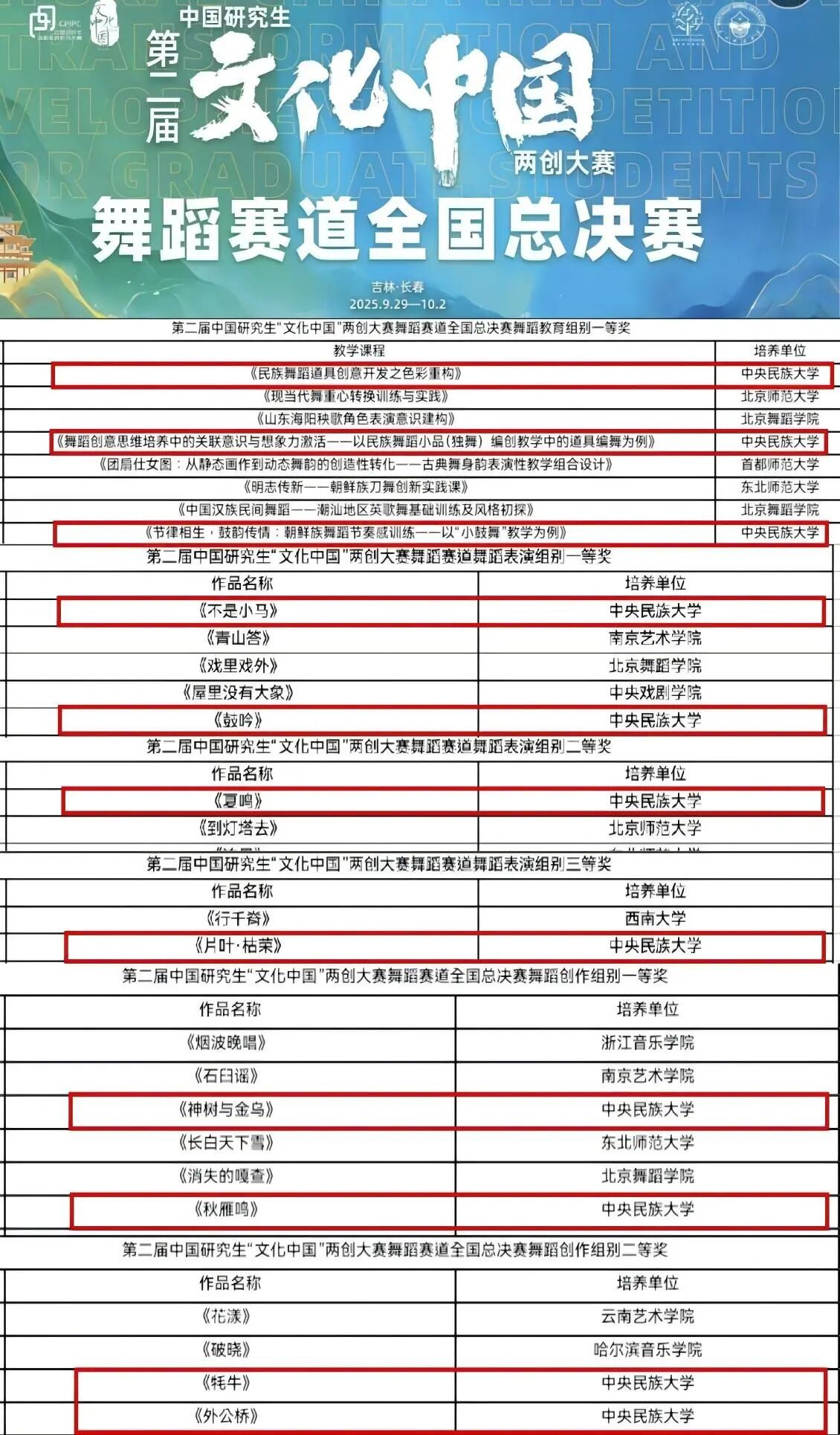 2025年10月2日,由教育部学位管理与研究生教育司指导、中国学位与研究生教育学会主办的第二届中国研究生“文化中国”两创大赛(舞蹈赛道)全国总决赛在东北师范大学圆满落幕,中央民族大学威廉希尔williamhill官方网站在此次比赛中再度绽放光彩,在创作、表演、教育三大赛道中获得亮眼战绩,交出了一份彰显民族舞蹈“两创”活力的优异答卷。