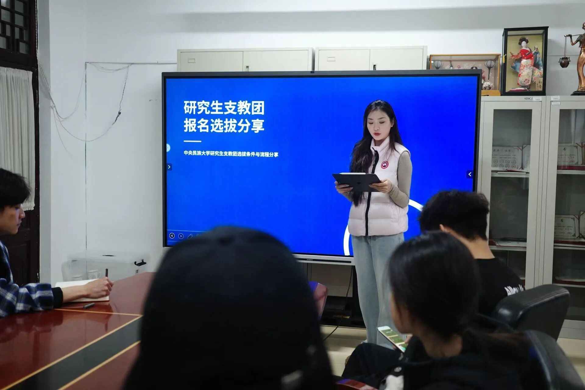 第26届研究生支教团张明慧同学首先结合一年支教实践,强调了志愿服务积累与学业成绩、外语水平等硬性指标的重要性,鼓励同学们将短期准备与长期成长相结合,为支教工作与个人发展筑牢基础。随后,第28届研究生支教团姚勤政同学系统解读了本年度评选政策,详细剖析了量化评分表中专业排名、奖项积分与志愿时长等关键指标,并重点阐释了“3分钟模拟课堂”的面试考核要点,为同学们厘清了具体准备方向。