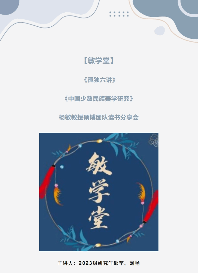 2023级研究生刘畅分享了邓佑玲教授的《中国少数民族美学研究》。首先,她阐释了中国少数民族美学的基本理论。其次,结合自身实践经历,着重对“中国少数民族审美模式的存在形态”这一章节进行了深入分析,用生动的案例诠释了各个民族的审美模式是对审美心理、审美观念、审美情趣、审美理想的抽象概括。最后,她呼吁大家学习与反思不同民族的历史文化及审美成因,取其精华,实现认识自身、提升自身和丰富自身的终极目标。