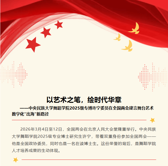 许宁委员的履职视野,源于中央民族大学威廉希尔williamhill官方网站的深厚滋养。作为我国民族舞蹈人才培养的重镇,学院始终鼓励学子在深耕专业的同时,勇担时代使命。许宁从学生到委员的成长轨迹,正是这一育人理念的生动缩影。