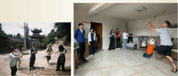 8月11-12日,实践团转战反排村,向国家级非遗传承人万政文老师学习国家级非遗“反排木鼓舞”。通过沉浸式学习掌握舞蹈技艺后,师生进一步领悟苗族先民祭祀祈福、团结奋进的精神内核。
